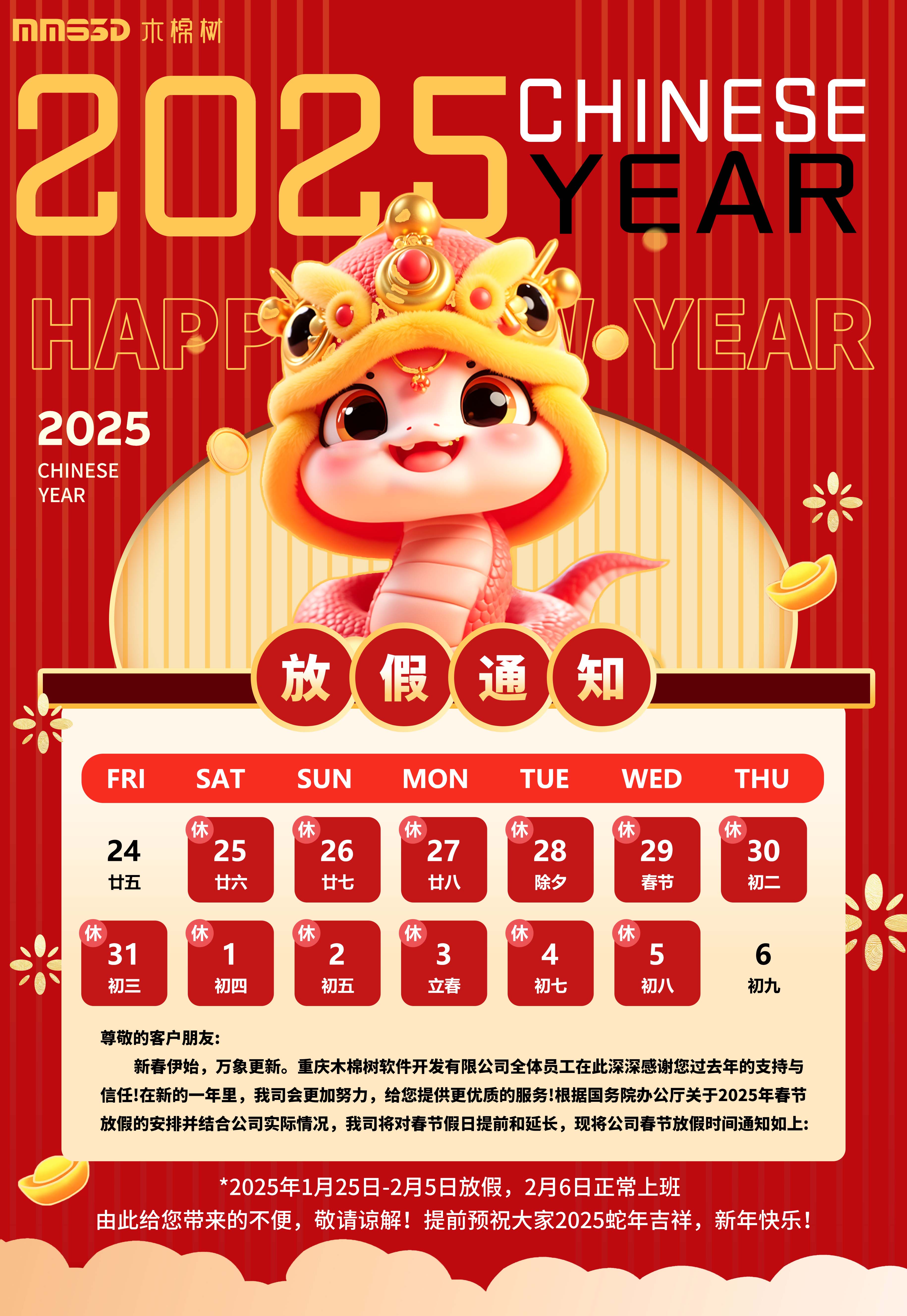 新春伊始,万象更新。重庆木棉树软件开发有限公司全体员工在此深深感谢您过去年的支持与信任!在新的一年里,我们会更加努力,为您提供更优质的产品和服务!根据国务院办公厅关于2025年春节放假的安排并结合公司实际情况,我们将对春节假日提前和延后,现将公司春节放假时间通知如上:2025年1月25日-2月5日放假,2月6日正常上班,由此给您带来的不便,敬请谅解!提前预祝大家2025蛇年吉祥,新年快乐!